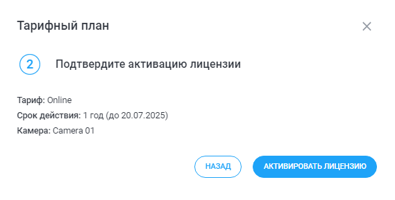 Срок действия лицензии отсчитывается от момента её активации — т.е. первого назначения лицензии на камеру. Если лицензия освобождается (при удалении камеры или смене тарифа), срок её действия продолжает истекать.