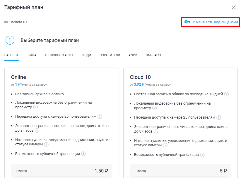Лицензионный код – это специальный код, ввод которого позволяет активировать на камере подписку на один из тарифов в сервисе. При этом:
