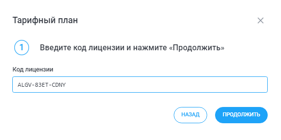1. Лицензионный код активируется при подключении тарифного плана. Для этого на этапе выбора тарифа нажмите на ссылку У меня есть код лицензии в правом верхнем углу.
